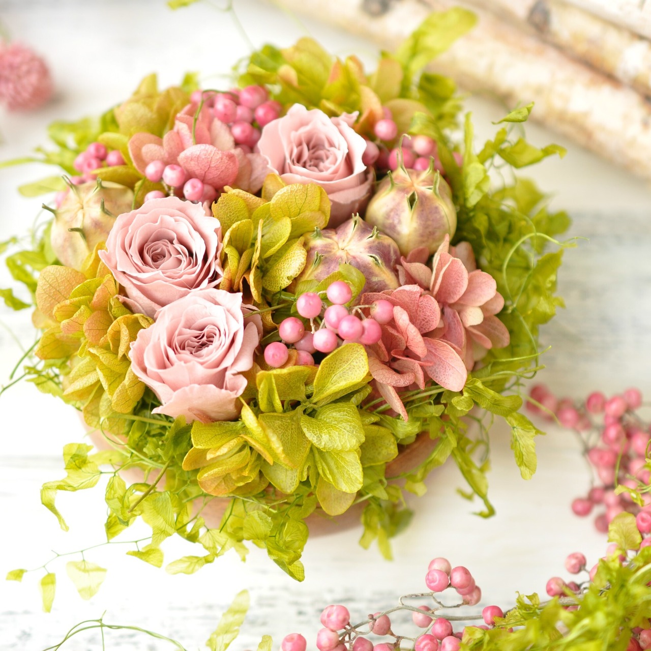 ・プリザーブドフラワーとドライフラワーでお作りしていますので直射日光や高温多湿を避けていただきますと長く楽しんでいただけます。