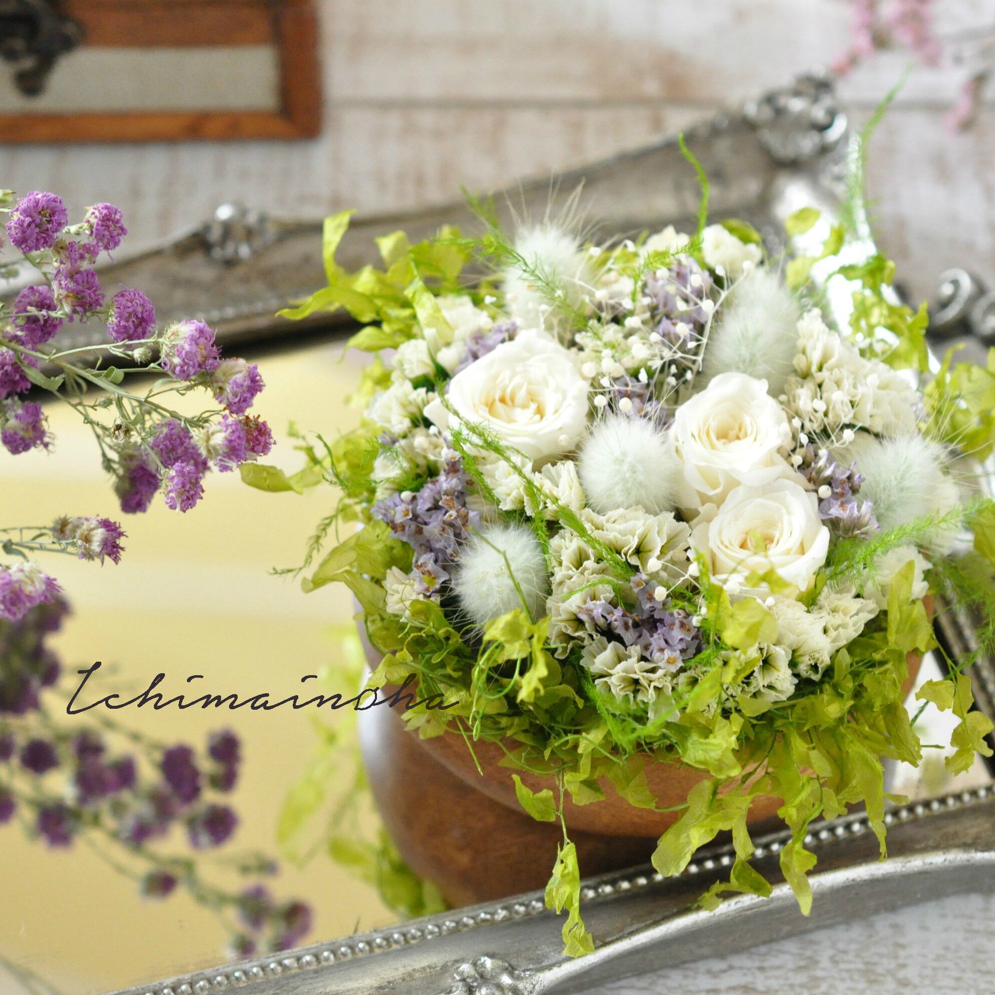 ・プリザーブドフラワーとドライフラワーでお作りしていますので直射日光や高温多湿を避けていただきますと長く楽しんでいただけます。